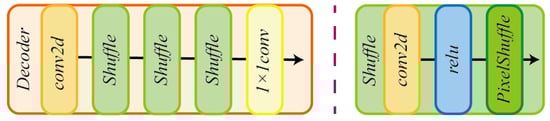 - Main Decoder: Feature maps generated from the main-encoder are fed into the main-decoder to predict the semantic segmentation results of the drivable road area. To maximize the robustness of decoding both original and perturbed features from different encoders, after one Conv2d layer, we only employ the simple 1 × 1 2d-convolution and three pixel shuffle modules as the main-decoder, where a pixel shuffle module consists of three layers: Conv2d, ReLU, and PixelShuffle, shown in Figure 4.Figure 4. The detailed structures of the main decoder.