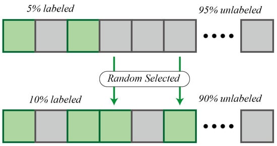 Whether the Cityscapes dataset or the CamVid dataset is used, their data are all labeled data. Thus, in unsupervised training, a certain percentage of images are randomly selected from the original training set, considering them as unlabeled data by ignoring their corresponding labels, and the rest of the data are kept intact for supervised training. Figure 5 illustrates the above operations.