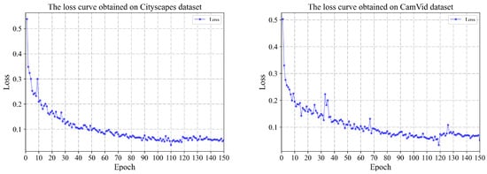 In Figure 6, it can be observed that on both datasets the models have approximate convergence after the 110th epoch. Loss has more fluctuations on CamVid than on Cityscapes because that the latter has a larger numbers and sizes of images than the former.