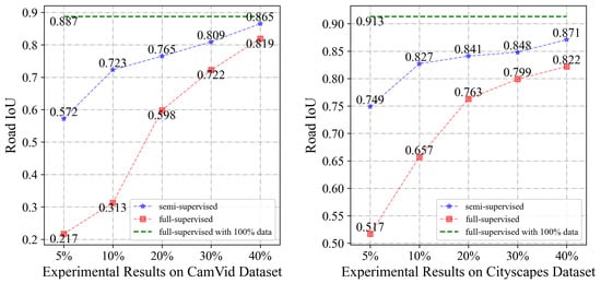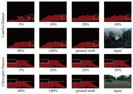 Figure 7 displays the line charts of the relationship between proportions of labeled data and IoU on two datasets and Figure 8 shows the corresponding visualization of the predictions by semi-supervised models on a certain input. It can be seen from Figure 7 that there is a significant gap between the IoU of fully supervised and semi-supervised methods when the proportions of labeled data are lower than 20%. With over 40% labeled data, no significant reduction in IoU in semi-supervised training is found compared with the baseline. For example, on the CamVid dataset, the IoU difference between 40% labeled semi-supervised models and fully supervised ones is only 0.022.