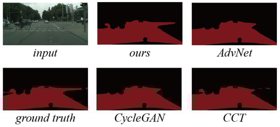 Examples of making predictions on certain images from Cityscapes using our method and others (CycleGAN, AdvNet, and CCT).