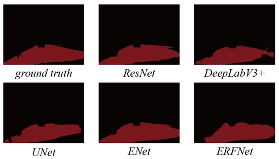 To verify the generalizability and extensibility of our semi-supervised method, we added auxiliary modules in the same way that our semi-supervised methods do on different basic segmentation models and ensured that the perturbed predictions is consistent with the originals. The classical semantic segmentation models that we selected included UNet [], ENet [], ERFNet [], and DeepLabV3+ []. And the experiments were conducted on the CamVid dataset. During semi-supervised training, the proportion of labeled data was set to 40%, indicated by “semi” in Table 7. Fully supervised experiments were performed on both 40% and 100% of total data for comparison, which are represented by “full” below the different percentages of data in the header of Table 7. The results are shown in Table 7 and Figure 11.