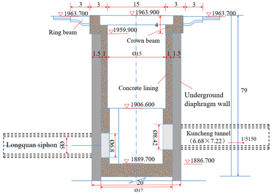 Illustrated in Figure 4, the enclosure structure is characterized by a circular underground diaphragm wall that is 1.5 m in thickness, complemented by an inner lining wall that is 1 m in thickness. The excavation depth of the foundation pit is recorded at 79.5 m. The main structure of the enclosure was erected using the open-cut and reverse construction approach.