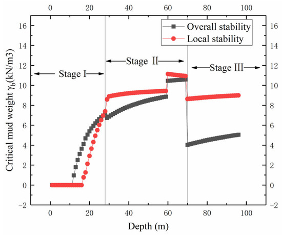 The determination of both the overall stability and local stability of the double-angled trench section of the circular ground connection wall is presented in Figure 10. It can be observed from the figure that with the increase in the depth, the slurry weight necessary to maintain the stability of the diaphragm wall exhibits an initial rise followed by stabilization. This entire process can be divided into three stages.