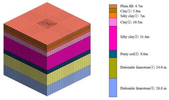 The underground continuous walls were constructed in strata primarily consisting of soft soil, which included silty clay and peat soil. The soft soil was characterized by high natural water content, low permeability, and low shear strength. It was classified as a highly sensitive soil layer, which tended to exhibit significantly reduced strength when disturbed. Therefore, treatment of the base soft soil and weak soil layers was required. The silty soil layer was susceptible to flow and sand flow, and the stability of the soil layer after excavation was weak. Table 1 presents the physical and mechanical properties of the geotechnical parameters involved.