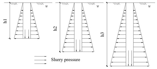 In the model, the trench wall was designed with a depth of 96 m and featured a multi-step configuration with five steps, each approximately 20 m in length. To ensure its stability, the excavation surface was subjected to slurry pressure after each excavation stage. Subsequently, the slurry pressure was gradually reduced as the excavation progressed towards the base of the trough section until the trench wall reached a critical limit and underwent destabilization, ultimately leading to its collapse. The height of the slurry liquid was set to 1 m below the ground, and the slurry pressure , where hi represents different depths (Figure 13).