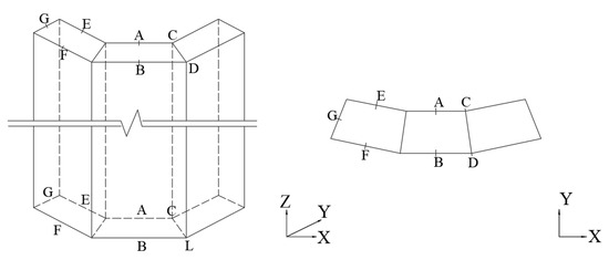 The monitoring point selection process was critical to assessing the displacement behavior of the extraction trench wall. To achieve this, the depth of Z = −62 m in the peaty soil layer was strategically chosen while setting the slurry weight at . The results, as presented in Figure 14, showed that significant displacement was mainly concentrated at the center and the angle of the trench section. Based on this observation, a series of monitoring points were carefully selected, as illustrated in Figure 15. The displacement curves of the selected monitoring points, plotted against the depth, are presented in Figure 16, with positive values indicating displacement towards the inside of the trench and negative values indicating displacement towards the outside of the trench wall.