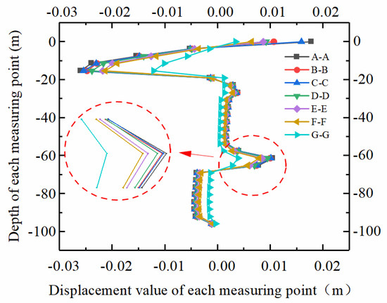 According to the data presented in Figure 17, the displacement values of each point follow a consistent pattern, with the middle of the inner side of A-A being the most vulnerable area to damage in the circular ground connection wall with a double-angle trench. Whether it is the general instability failure in the shallow part or the local instability failure at depths of 60~70 m, the order of displacement values is A-A > C-C > B-B > D-D > E-E > F-F > G-G. Therefore, the corresponding measuring points on the A-A, B-B, C-C, and D-D measurement lines at Z = −62 m were selected for the further analysis of the local instability and damage points at depths of 60–70 m. As the slurry pressure decreases, the displacement change curve and change rate are as presented in Figure 17.