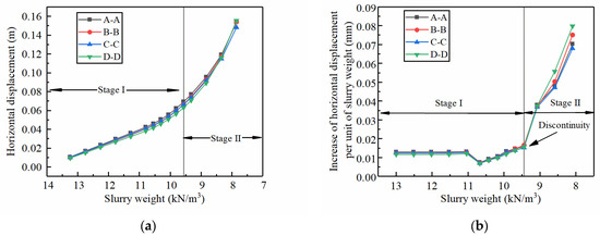 The findings presented in Figure 18 reveal a noteworthy trend in the horizontal displacement of each measurement point as the slurry weight decreases. Notably, the increase in displacement can be classified into two distinctive stages, a linear stage I and an exponential stage II. During stage I, when the slurry weight is above 9.5 kN/m3, each location displacement displays a linear growth trend in response to a decrease in slurry weight. Conversely, when the slurry weight falls below 9.5 kN/m3 in stage II, the displacement at each location shows an exponential growth trend. Interestingly, Figure 18 shows a sudden change in the rate of displacement as the slurry weight drops to approximately 9.5 kN/m3, indicating a shift from stage I to stage II. Collectively, these results demonstrate that the critical slurry weight for the diaphragm wall is approximately 9.5 kN/m3, as determined by the numerical simulation.