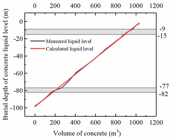 Figure 19 compares the calculated rising height of concrete with the actual rising height of concrete, as well as identifying the presence of any collapsed holes in the underground continuous wall. The calculated rising height of concrete represents the theoretical height of the liquid surface that should rise after pouring concrete, whereas the actual rising height of concrete refers to the measured height of the liquid surface on-site. A slow-down in the slope of the actual ascending height line may suggest the presence of a collapsed hole. Our results demonstrate that the slope of the actual ascending height line tends to slow down at the depth of 9~15 m and 77~82 m from the top of the wall, indicating the suspected location of the collapsed hole in the wall. This indicates that a heavier slurry is needed here for containment. This finding was found to be consistent with the results of ultrasonic trenching inspection records depicted in Figure 11, verifying the correctness of the 3D sliding force balance analysis proposed in Section 2.
