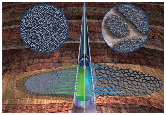 In the past decades, quartz sand and ceramsite were mostly used as proppants [17]. The shapes of proppants were round, oval, cylindrical, and so on [18,19]. The shape of the proppants had a certain impact on fracture permeability, but the impact was limited. The size of the proppant has an obvious influence on the crack permeability. According to the traditional permeability evaluation theory, for example, Osiptsov’s model k/R2 = 0.204φ4.58 [20], the larger the proppant particle size, the greater the fracture permeability under the premise of constant porosity. This conclusion can also be confirmed by the other permeability models [21,22]. At present, the commonly used proppant type is mainly between 8 and 140 mesh, and the corresponding particle size range is 2.36–0.106 mm [17,23,24]. Usually, these small-sized proppants exist between the fractures in the form of continuous packet, as shown in the left part of Figure 1.