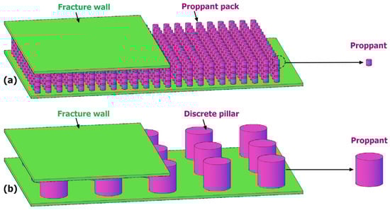 Idea of large-size proppant proposed by Li et al. [13]. (a) The upper part is the traditional fracture–proppant model, where the proppant pack consist of a great number of small-size proppants. (b) The lower part is the creative fracture–proppant model, where the proppant has a larger size and is arranged in the form of a discrete pillar in the fracture.