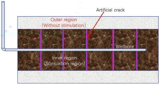 For the reservoir simulation, there are many flow models, such as the double medium model and the triple medium model [30,31]. The most representative triple medium model is the trilinear seepage model. This paper introduces the traditional triple media model theory by taking the trilinear seepage model as an example. The purpose of this introduction is that this paper develops a numerical simulation program based on the trilinear model theory, which can be used for the reservoir simulation and gas production assessment. The premise assumption adopted by the trilinear seepage model is that after the large-scale hydraulic fracturing, as shown in Figure 3, the reservoir in the near well area is divided into several cuboid areas due to the existence of artificial fractures, which are called the inner stimulation region (referred to as the inner region). The region outside the stimulation area is called the original reservoir region (referred to as the outer region) because it is not subject to the stimulation effect of artificial fracturing. The specific assumptions of the trilinear flow model include [13,30,31,32]: