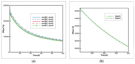 Production rate comparison. (a) Grid dependence test. (b) Convergence test.