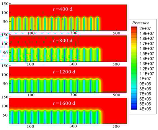According to the above reservoir parameters, well parameters, and calculation parameters, the flow process is simulated in the reservoir fracture systems containing small-sized proppant and large-sized proppant, respectively. Partial simulation results are shown in Figure 11. It is seen that the gas pressure in the reservoir decreases gradually with the increase in time (Figure 11 and Figure 12). Nearest the wellbore area, the gas pressure is the lowest. The farther away from the wellbore, the higher the gas pressure. Comparing the reservoirs with different proppant types, it is found that the pressure of reservoirs with large-sized proppant decreases faster, and the corresponding natural gas production rate is higher, which is confirmed by Figure 13. With the increase in production time, the production efficiency decreases gradually, but the gas production rate of the large proppant reservoir is higher.