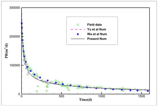 In this paper, based on the above model equations and numerical calculation methods, the one-dimensional, two-dimensional, and three-dimensional calculation programs are developed. The reliability of the developed program has been examined and verified by comparing the simulation results with the field production data; for example, by comparing with the Barnett Basin gas production data. The detailed validation can be found in previous research [13]. Here, we give an example to further validate the reliability of the present computation program.