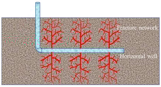 Schematic diagram of the fracturing reservoir and the horizontal extraction well. Fracture network forms in the reservoir.
