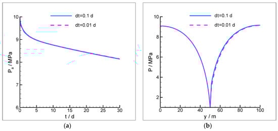 Comparison of the reservoir gas pressure when adopting different time steps. (a) The evolution curve of the average gas pressure during the first 30 days. (b) The gas pressure distribution on the central axis (x = 50 m) at t = 30 days.