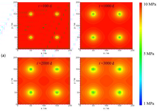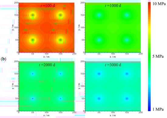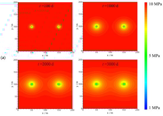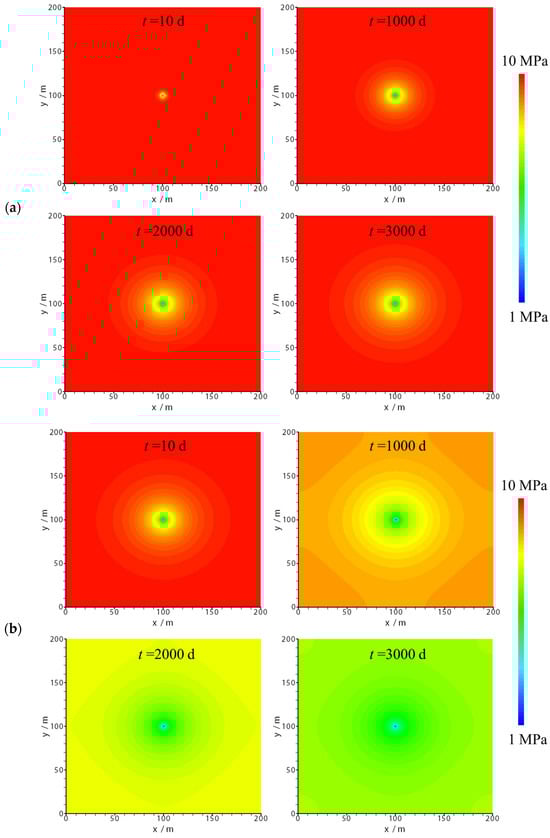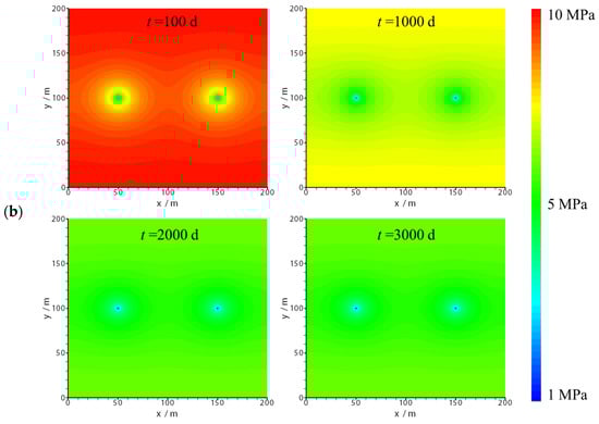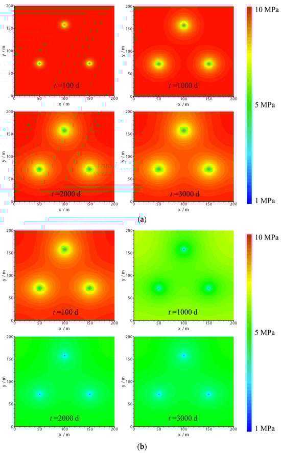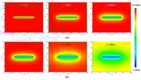 The pressure distribution in the fracturing reservoirs containing a horizontal well. (a) Case 1: lower-permeability reservoir induced by the continuous small-sized proppant packet. (b) Case 2: higher-permeability reservoir induced by discontinuous large-sized proppant pillar. The legend range varies from 1 MPa (blue) to 10 MPa (red).
