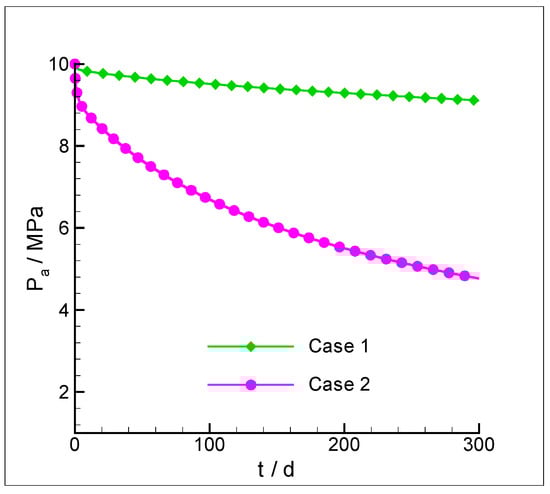 The evolution trend of the average pressure in two kinds of propped reservoirs. Case 1 is the lower-permeability reservoir. Case 2 is the higher-permeability reservoir.