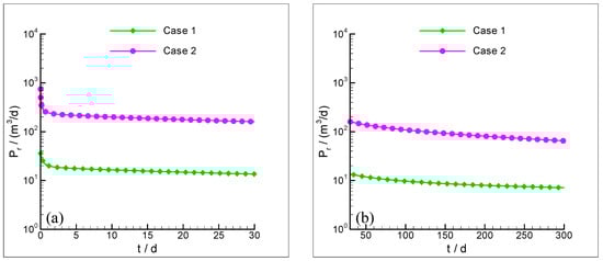 The evolution trend of the gas production rate in two kinds of propped reservoir. (a) Production rate variation during the first 30 days. (b) Production rate variation from the 30th day to 300th day.
