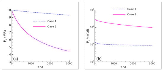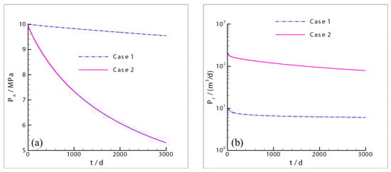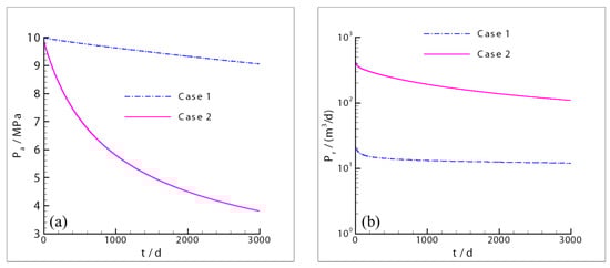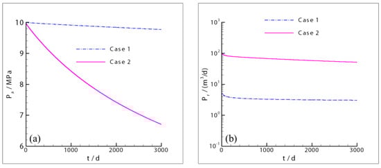 Result comparison of two kinds of reservoirs with different permeability when adopting two vertical extraction wells. (a) The average gas pressure variation in the reservoirs. (b) The gas production rate evolution in the reservoirs.