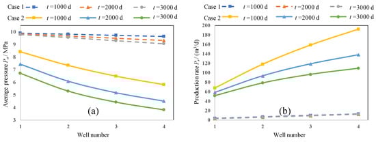 Reservoir average pressure and production rate variation with the well number. (a) Comparison of the average pressure for case 1 and case 2. (b) Comparison of the production rate for case 1 and case 2.