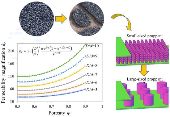 where d = 2re is the equivalent diameter of the small-sized proppant and D is the diameter of the large-sized proppant. It is noteworthy that Formula (21) is based on the premise of D = h. Nonetheless, the Formula (21) can be used to assess the permeability magnification of the fracture.