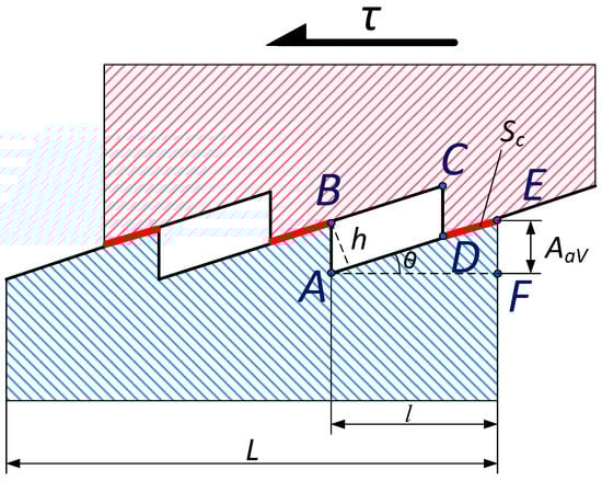 Fault wall contact schematic representation. —average height of surface asperities; ϴ—angle of local inclination of surface asperities; l—average length of surface asperities; Sc—wall contact area, L—size of fault reactivation area; red and blue colors—the hanging-wall block and footwall block of a fault accordingly; A–F—vertexes of the asperities; h, ϴ—parameters of the asperities; τ—displacement direction of the hanging-wall block, explanation is below in the text.