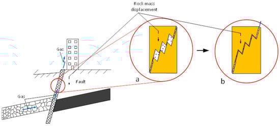 Schematic representation of pathways: mine gases migrating to the surface due to piston effect created by the relative displacement of the tectonic fault walls; (a)—“ridge-ridge” type of contact; (b)—“ridge-sag” type of contact.