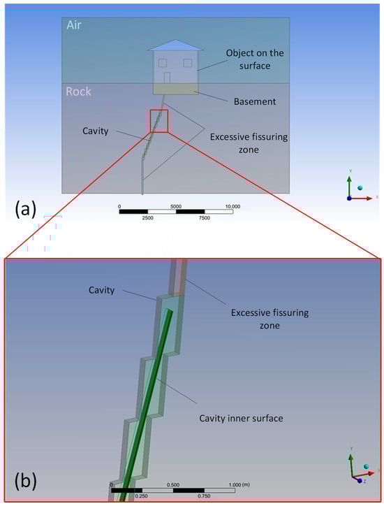 Computer-generated model of the subject of research: (a)—general view, (b)—close-up view of area with cavity.