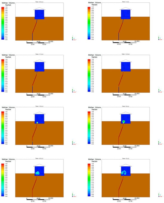 The simulation results are presented in Figure 5, Figure 6 and Figure 7. From Figure 5, it can be seen that, at the initial moment (0–1 s, stage 1), the process of gas migration through the permeable zone is mildly expressed. When pressure increases (1–2 s, stage 2), intensive gas migration to the surface begins and, at the third stage (2–3 s), the process of gas migration continues. Therefore, even a one-off increase in pressure up to 250 Pa is capable of triggering mass transport of gases along the tectonic fault plane to the surface in a short span of time.