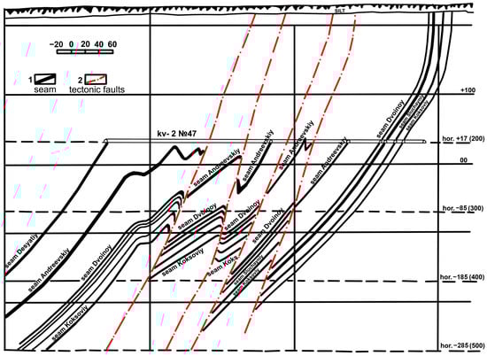 As an example, let us consider the following case: activation of subsidence processes in the north of Kuzbass. Kuzbass is a mining–industrial region of Russia with an unfavorable environmental situation [65,66,67,68]. Here, the Sudzhenskaya and the Anzherskaya mines were working out Tenth, Andreevsky, and Koksovy seams. The percentage of sandstones in the coal-bearing strata is up to 70–80% in the region There are major tectonic faults in the mine field, traced from the earth’s surface to the depth of mining, Figure 8, according to [69]. Gas monitoring at these mine fields in 2012–2013 revealed instability of gas-dynamic processes. For carbon dioxide, concentrations of up to 5.3% were recorded, which is beyond the prescribed limit [70].