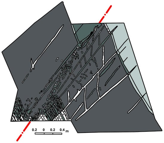 Sketch of a tectonic fault at the Anzherskaya mine (according to [69]). Red line—fault plane, gray color—formation, green, light green—rocks, white—cavity.