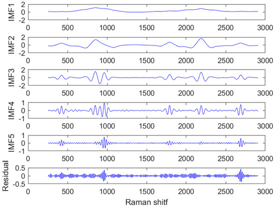 The VMD algorithm decomposes the Raman spectral sequences with initial parameters set as: α value is set to 4000 to adjust the bandwidth of each modal component to a proper level, is set to 0.00001, is set to 0, K is initialized as 1, and the threshold of is set to 0.03. The parameters are then iteratively updated using the VMD decomposition algorithm, calculating the decomposition error each time.
