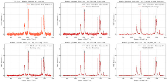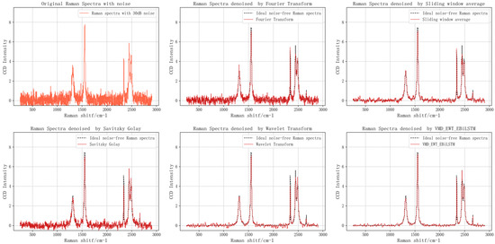 To further validate the performance of the VMD–EWT–EBiLSTM network architecture for Raman spectral denoising, comparative experiments are conducted with four state-of-the-art denoising methods, including Fourier transform [31], Savitzky–Golay filtering [11], sliding window averaging [32], and wavelet thresholding [33].