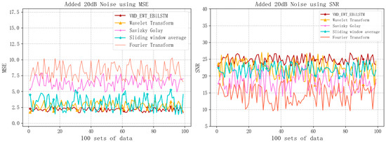 To thoroughly validate the denoising performance of the VMD–EWT–EBiLSTM network architecture, comprehensive performance analysis is carried out on the test set under 20 dB and 30 dB random noise conditions, by examining the denoising outcomes from each algorithm. The MSE and SNR objective metrics are utilized to quantify the results, which are presented in Figure 11 and Figure 12.