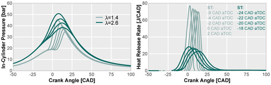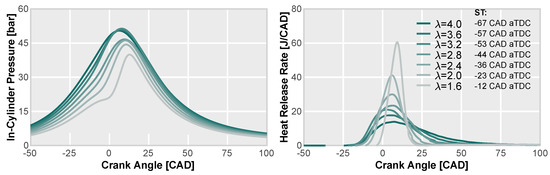 Figure 2 depicts the cycle-averaged profiles of the in-cylinder pressure and heat release rate (HRR). These profiles were obtained from the low-load operating point (4.96 mg/str H2) at 1500 rpm as the dilution rate was increased. The achievement of conditions for maximum brake torque (MBT) involved spark timing optimization. For this purpose, the characterization of the air dilution was accomplished through the air-fuel equivalence ratio parameter () using the PFI system.