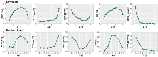 For the low-load point, the following trends emerge. Instabilities, as indicated by COVIMEP, begin to increase more steeply at around = 3.2. The specific fuel consumption reaches its minimum value at = 3.2, coinciding with the air dilution ratio that maximizes the engine performance and efficiency. At this point, the engine achieves an IMEP of 5.2 bar, corresponding to 40% of the gross indicated efficiency (GIE).