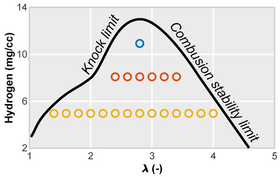 During engine operation, certain limitations reported in the literature on PFI-based H2-engines were identified. Figure 5 includes all the measured data points to provide an overview of the operational limits as a function of the air dilution and engine load.