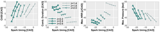 By expanding the range of values (as shown in Figure 7), we can confirm the trends described earlier. The spark timing plays a crucial role in controlling the combustion phasing, as evident from the linear trends depicted in Figure 7. As increases, the influence of the spark timing on the combustion phasing becomes more pronounced, making precise control challenging. Even minor adjustments in the spark timing can lead to significant changes in the combustion phasing. Additionally, it becomes clear that maintaining the desired combustion phasing as increases necessitates advancing the spark timing.