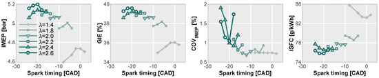 Figure 8 displays the primary engine parameters for the same conditions as shown in Figure 7. Concerning the engine performance, one can observe that the trends become flatter as increases. However, the range within which the combustion remains stable becomes more limited as the dilution increases. For instance, in the case of = 1.4, there is no discernible effect of the spark timing on the combustion stability. Nevertheless, COVIMEP rapidly increases with spark timing variations at = 2.6.