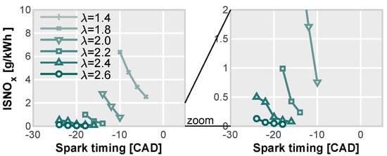 Traditionally, spark timing has also been employed to delay combustion in order to control NOx emissions. However, the influence of the spark timing on these emissions is minimized under lean combustion conditions, as illustrated in Figure 9. Lower local temperatures inhibit the NOx thermal formation mechanism, thereby diminishing the impact of delayed combustion.