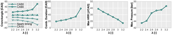 Maximum in-cylinder pressure and HRR peaks, characteristic combustion periods (CA10, CA50, and CA90), spark timing, combustion duration periods (CA-Spark timing, CA50-CA10, and CA90-CA10) obtained at 1500 rpm engine speed and low-load conditions for various values. Combustion phasing was optimized to achieve MBT conditions, and the results were obtained using the PFI system.