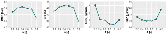 For the mid-load point, the operating range for dilution spans from = 2.4 to 3.4. The lowest achievable dilution value is = 2.4. Higher dilutions are necessary to reduce the risk of abnormal combustion (knocking), which can lead to engine damage, especially considering the higher pressure and temperatures reached in the combustion chamber. The engine performance starts to decline when the air dilution equivalence ratio exceeds 3.4, consistent with the trend observed at low-load conditions. At = 3, a peak in GIE and IMEP is observed. This trend holds true for both low- and mid-load conditions, where the combustion process becomes less efficient as increases. The minimum specific fuel consumption drops below 74 g/kWh, with an efficiency and engine performance improvement, with IMEP exceeding 8.7 bar.