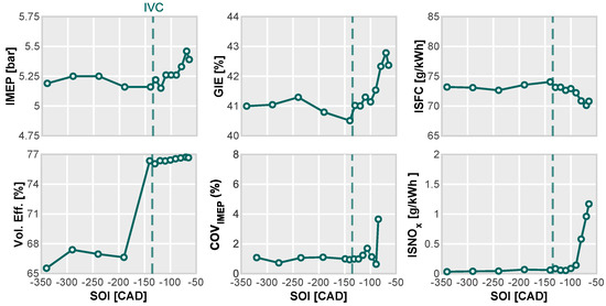 In Figure 12, we depict the main engine performance parameters while varying the SOI and maintaining a constant air-to-fuel ratio ( = 2.6). Two distinct trends can be discerned associated with the timing of the intake valve closing event. With injection before IVC, the engine performance exhibits minimal fluctuations with SOI retardation. The thermal efficiency hovers around 40%, and the CCV remains consistently below or close to 1%, underscoring the noteworthy operational stability.