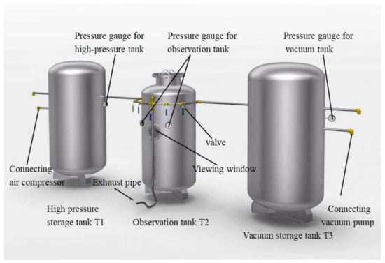 Pressure monitoring devices were arranged on each steel tank, including a pressure gauge on T1, a vacuum gauge on T3, and two high-range vacuum pressure gauges on T2, which could monitor both positive and negative pressure. The measuring range of the pressure gauge used was 1.6 MPa, the scale value was 0.05 MPa, the measuring range of the vacuum gauge was −0.1 MPa, the scale value was 0.002 MPa, the measuring range of the vacuum pressure gauge was from −0.1 to 0.9 MPa, the scale value was 0.02 MPa, and each range was within the pressure range involved in the test.