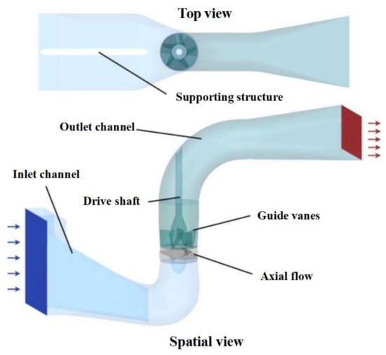 Alden’s team [17,18] designed a spiral centrifugal single-blade runner to reduce the pressure gradient and velocity gradient on the runner blade. Voith’s team [19,20] put forward a new design concept that could reduce the damage rate of mechanical fish, including reducing the gap in the flow channel, reasonably arranging the position of fixed guide vane and movable guide vane, and so on. Alstom [21,22] also designed a runner with minimum clearance from the same point of view as the Voith team. David [23] and Li [24] studied a kind of upward-flow hydraulic turbine, which removed the draft tube structure. This significantly increased the amount of dissolved air in the current, improved the drastic change in pressure, and reduced the damage caused by the fish passing through the machine. Zhang’s team from Jiangsu University in China and Bosman Water management Co., Ltd. in the Netherlands used the blade impact model [25] to predict the damage of fish passing through the pump. They also designed axial flow pump runners with low impact and no impact damage. Pan et al. [26] combined the Lagrangian tracking method with computational fluid dynamics to discuss the motion behavior and damage mechanism of fish passing through an axial flow pump.