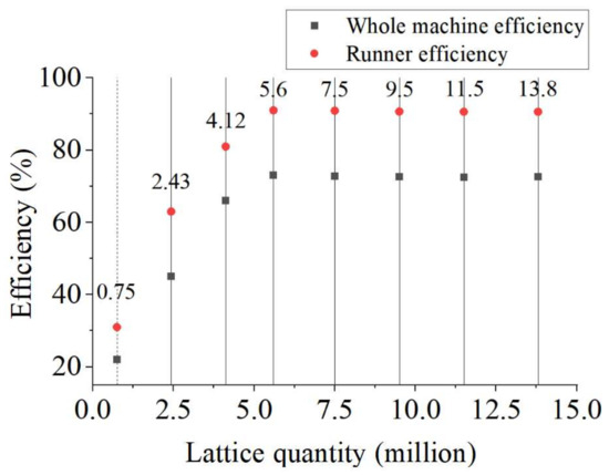 In this paper, the time step was calculated by the combination of the Coulomb number and local lattice scale, which was generated dynamically by the algorithm. The Coulomb number is a parameter that characterizes whether the calculation conforms to the CFL condition, usually between 0.2 and 1. In order to ensure the robustness of the calculation, the Coulomb number was set to 0.4. The unsteady calculation of the axial flow pump was carried out by using several schemes with different analytical scales, and the irrelevant verification curve in Figure 4 was obtained. Because different lattice scales were used in the runner region and other regions, the runner efficiency and the whole machine efficiency were selected as the evaluation index of the lattice independence verification.