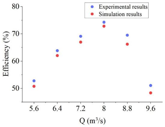 The axial flow pump model was based on the axial flow pump used at the Datao second pumping station in China. We simulated the efficiency of the axial flow pump under different flow conditions and compared it with the pump characteristic curve. The comparison between the calculated results and the actual efficiency is shown in Figure 6. The numerical simulation results were consistent with the changing trend of the characteristic curve. Therefore, the numerical calculation method in this paper was reliable.